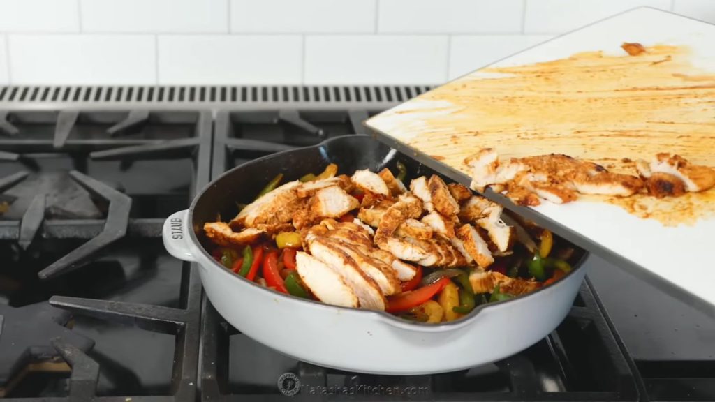 When the veggies are almost done, thinly slice your chicken against the grain and add it back to the pan. Once the ingredients are combined, take your skillet off the heat. To keep it warm before serving, cover it with a lid and toast your tortillas.