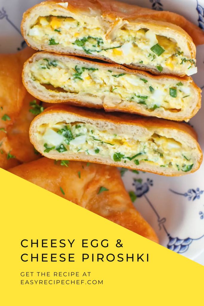 This recipe is for Egg and Cheese-Filled Piroshki, a Ukrainian dish consisting of savory dough pockets filled with a cheesy, eggy filling.
