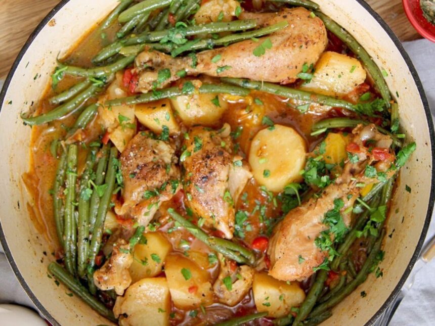 The green beans should be added last so that they don’t cook too much. Once the green beans are nestled into the broth, partially cover the pan with a lid and let it simmer on medium-low heat for 45 minutes to an hour, or until the potatoes are tender.